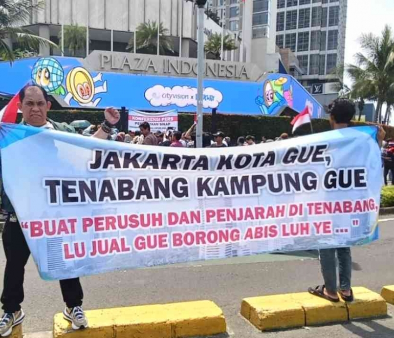“Jakarta kota gue, Tenabang kampung gue. Buat perusuh dan penjarah di Tenabang, lu jual gue borong abis luh ye…” begitu tulisan di salah satu spanduk.